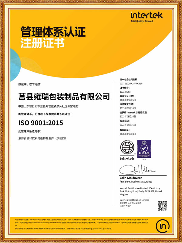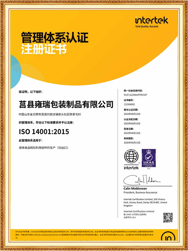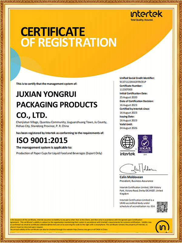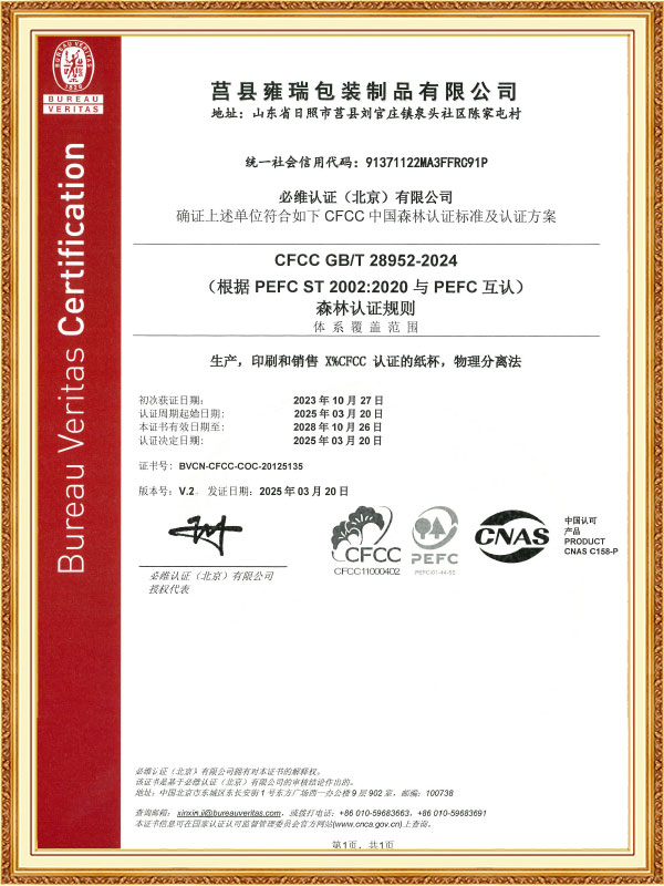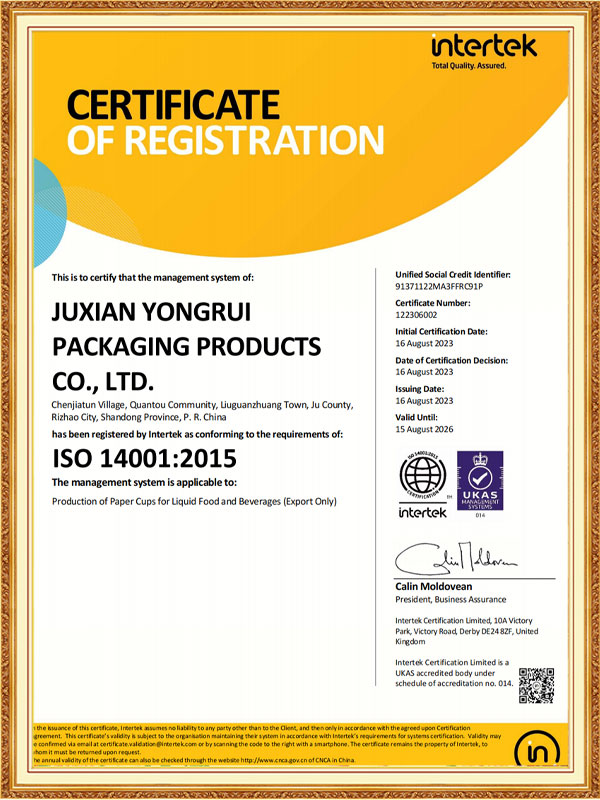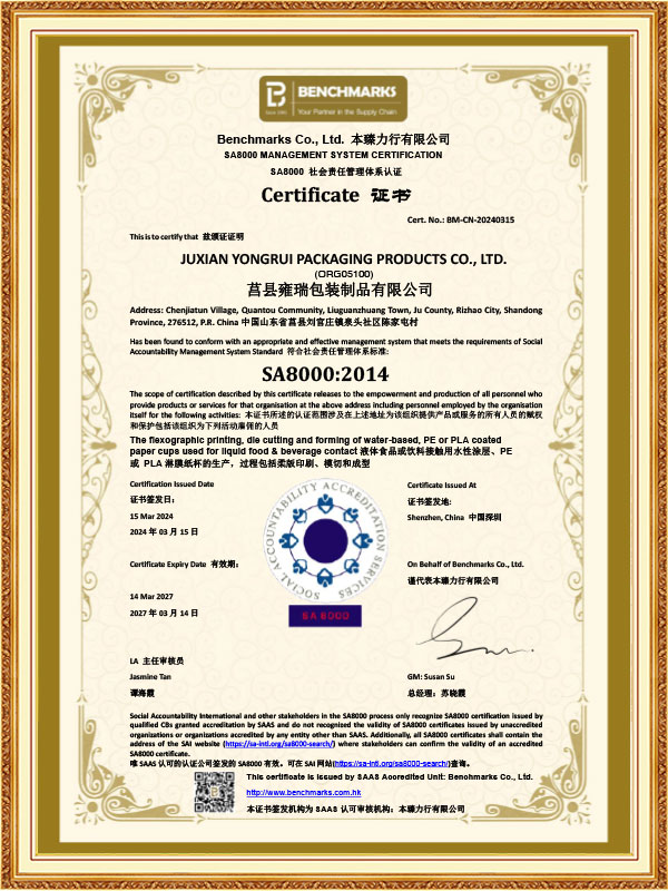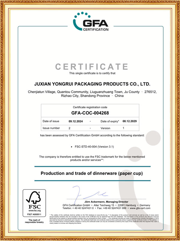 Untuk memenuhi standar internasional yang ketat, produk kami memiliki sertifikasi termasuk ISO 9001, ISO 14001, FSC, BRC, dan DIN dll. Lebih lanjut Yongrui Packaging sedang mengembangkan cangkir kertas yang terbuat dari bahan baku FSC dan EUDR, dengan tegas dan tak tergoyahkan memimpin industri kemasan menuju pembangunan berkelanjutan. Kami menawarkan layanan "one-stop" lengkap, dari desain hingga purna jual, tim kami siap membantu 24/7. Sementara itu, layanan OEM & ODM tersedia untuk membantu Anda membangun merek Anda.